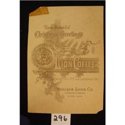 Woolsen Spice Ad Card. Lion Coffee. Unusual Santa in a green suit filling stockings at North Pole. Stone litho. Condition: Damaged corners.