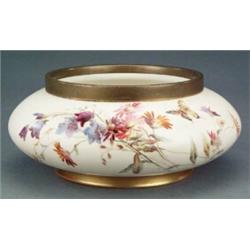 A Royal Worcester compressed circular bowl, painted with loose sprays and butterfly on a matt cream ground and with metal rim, 10in diam, date code for 1893