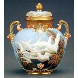 A Royal Worcester ovoid vase and cover, the borders of gilt and small pierced panels painted with swans in flight and reeds, etc, by C. Baldwyn, signed, on a matt pale blue ground, 6.5in high, date code for 1902