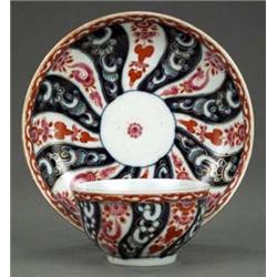 WORCESTER - A Worcester Queen Charlotte pattern tea bowl and saucer A Worcester Queen Charlotte pattern tea bowl and saucer, decorated with spiralling scrolls in the Imari palette of cobalt blue, iron-red and gilt, pseudo Chinese mark, c.1770