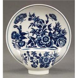 WORCESTER - A Worcester Three Flowers pattern tea bowl and saucer A Worcester Three Flowers pattern tea bowl and saucer, decorated with three flowers amidst scrolling foliage within tramline border, crescent mark, c.1775