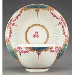 A Worcester finely fluted tea bowl and saucer, the border with small panels of turquoise cellular pattern with gilt scrolls and joined by puce flower festoons (2)