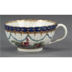 A Worcester fluted tea cup, painted with exotic birds below turquoise festoons, the royal blue border with gilt decoration, crescent mark in blue