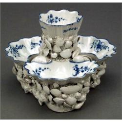 A Worcester triple shell pickle dish, with raised central bowl painted with flower sprays on shell, coral and seaweed encrusted base, 8in diam, c.1770( See: Henry Sandon, Worcester Porcelain, illus 123 for this form)
