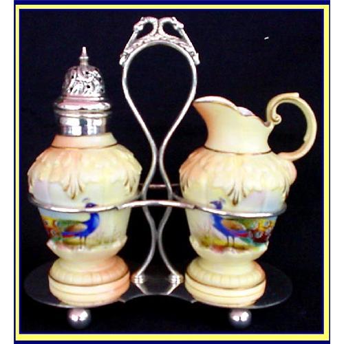 Signed handpainted peacock Locke Worcester sugar and creamer in figural silver plate stand with birds. England, 1900-1904. Stand by Walker and Hall, Sheffield.<BR>Total height is 7 1/2inches.<BR>Cream body with orange-tan variations, raised moulded acanthus leaves and gilded rims and highlights. Each piece is handpainted with a brightly coloured, crowned peacock in a <BR><BR>naturalistic setting. Hint of blue sky. Great detail.<BR>Each piece is signed by the artist: I LEWIS and marked in green underneath with the Shrub Hill Works mark, used between 1900-4.<BR>THe sugar has a wonderful repousse lid with openwork for scattering the sugar, done in classic Georgian style. Silver plate stand on round legs with double long-beaked dragon/bird finial <BR><BR>on top. Fully marked by the facory underneath. (Walker and Hall and Hard & Silver soldered).<BR>Excellent condition. No chips/cracks/damage to porcelain and no losses/dings/damage to silver.