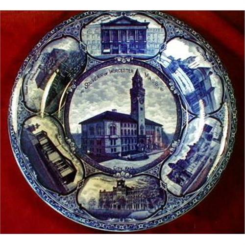 Beautiful cobalt blue souvenir transferware plate from Worcester, Massachusetts ( MA, MASS ). In the center is city hall. Around the rim are pictured (clockwise from top) Mechanics Hall, Post Office, Worcester Polytechnic Institute (WPI), Clark University, Court House and George Bancroft birthplace.