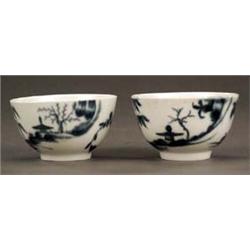 WORCESTER - Two Worcester blue and white Landslip pattern tea bowls Two Worcester blue and white Landslip pattern tea bowls, decorated with chrysanthemums, willow tree and pavilion on a rocky outcrop, crescent marks, c.1760