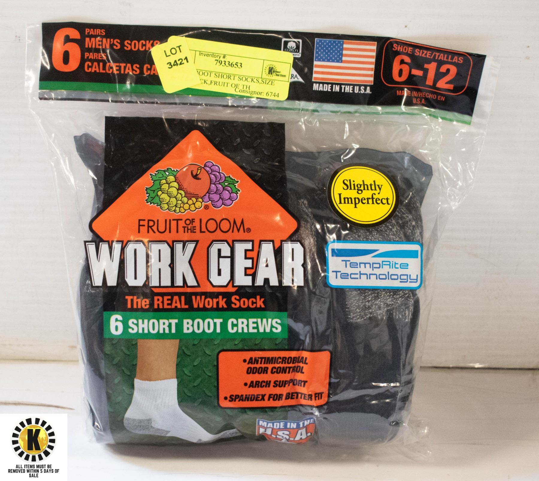 WORK BOOT SHORT SOCKS,SIZE 6-12,6-PACK,FRUIT OF TH