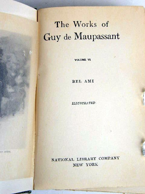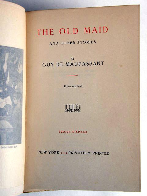 Edition D`Etratat, privately printed in New York by Bigelow, Smith and Co., copyright 1913 by the Edinburgh Society, limited to 1,000 sets, printed for subscribers only. Being an illustrated 10-volume set of de Maupassant`s short stories. Volume III lacking. Together with three volumes of a multi-volume set of de Maupassant`s works, "Bel Ami", "The Old Maid and Other Sotires" and "Fort Comme la Mort", published 1909 by Bigelow, Smith and Co. 12 pieces. Volume III of the first set lacking.