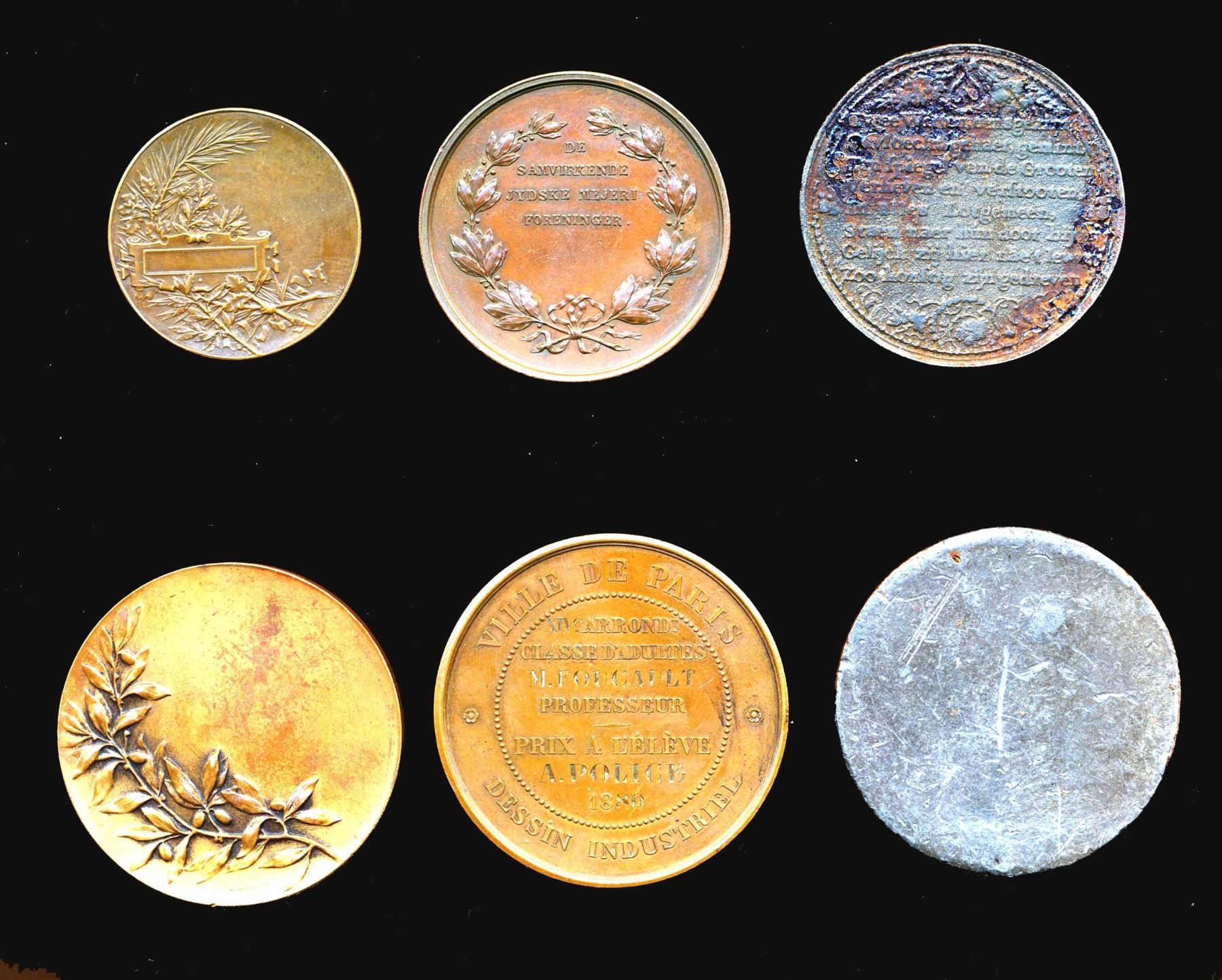 1660 DeWitt Death medal AE-47 30.3 gms. F, A Uniface 50 mm 3D Religious medal F, 1880 Named City of Paris Design medal AE-51 63.9 gms done in a Greek motif EF, 1890's French Choir medal AE-36 19.8 gms. EF, Undated Swiss made by Huguenin Mint, a Dutch Survivors' Medal AE-50 55.5 gms AU, Denmark undated Agricultural medal AE-45 38.9 gms. by F. Schmahlfeld EF.