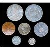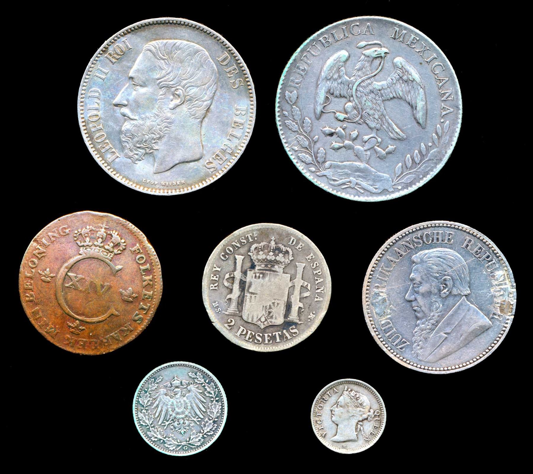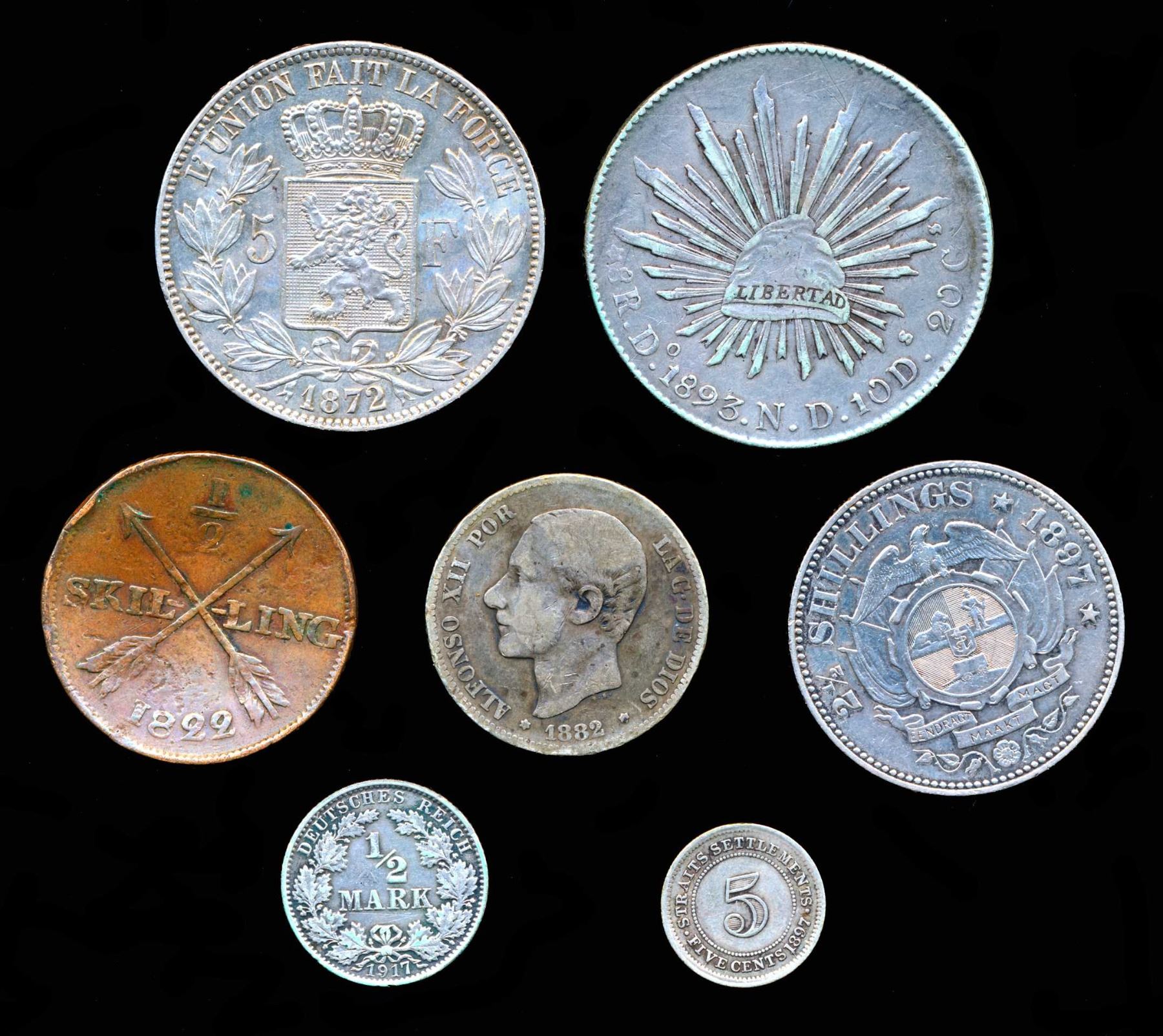 57.9gm. Silver 1872 Belgium 5 Francs KM# 24 VF+, !917G Germany 1/2 Mark KM#17 VF, 1893 Mexico Do. N.B. 8 Reales KM# 377.4 VF, 1897 South Africa 2-1/2 Shillings KM# 7 Jewellery piece VG, 1882 Spain 2 Pesetas KM# 678.2 VG, 1897 H Straits Settlements 5 Cents KM# 10 F & 1822 Sweden 1/2 Skillings KM# 596 VG.. All have a Cornacopia and BR stamped on the edge.