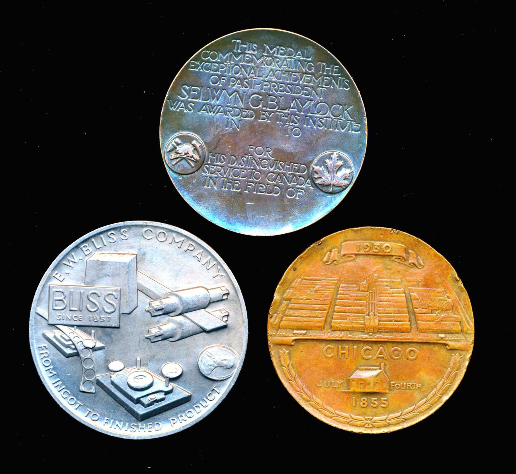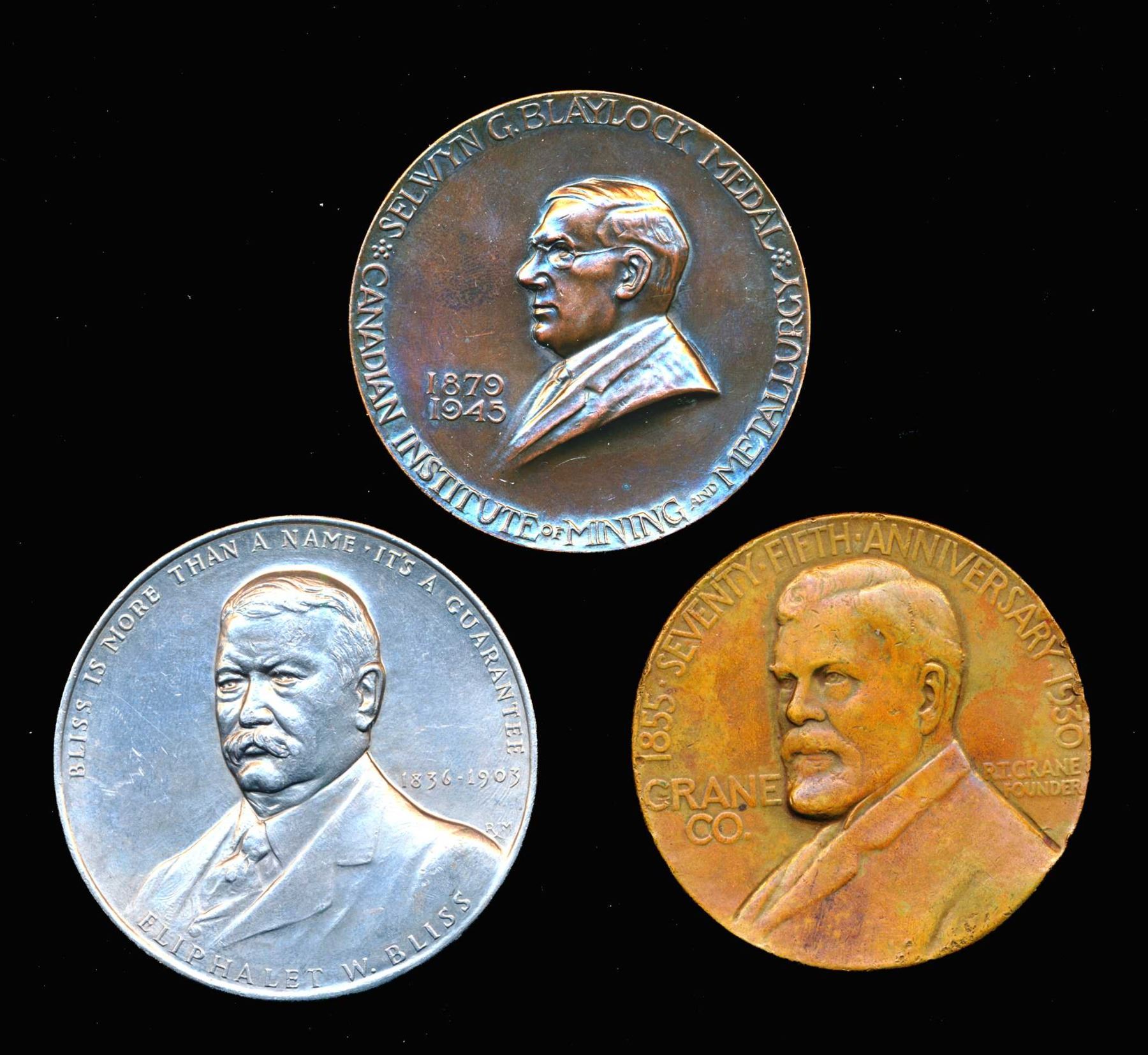 E.W. Bliss AL-66 Advertising medal Unc, R.T. Crane AE-63 75th. Anniversary Medal VF and 1945 AE-63 The S.G. Blaylock medal AE-63 un-named Canadian Institute of Mining and Metallurgy edge: Birks Unc.