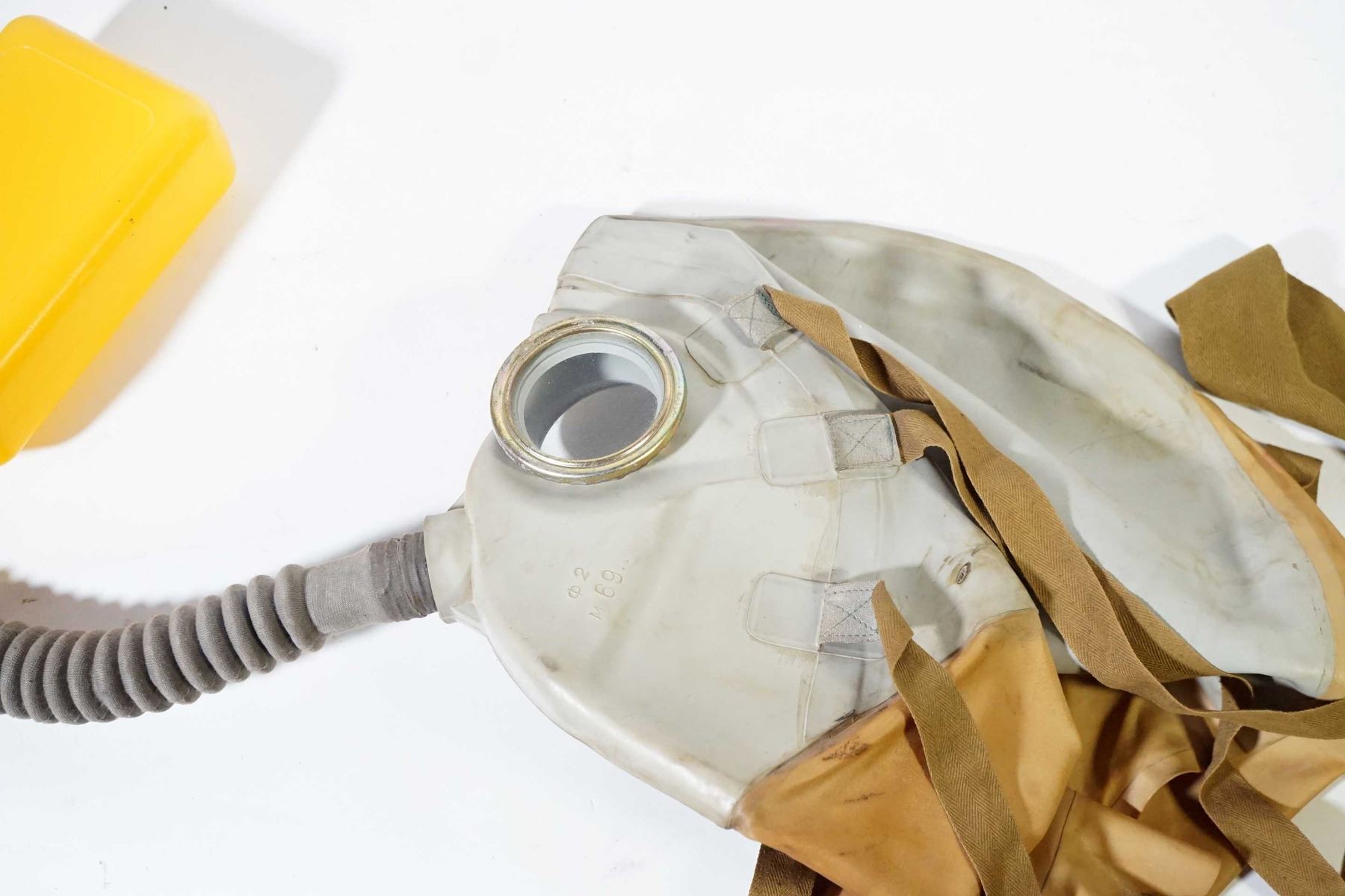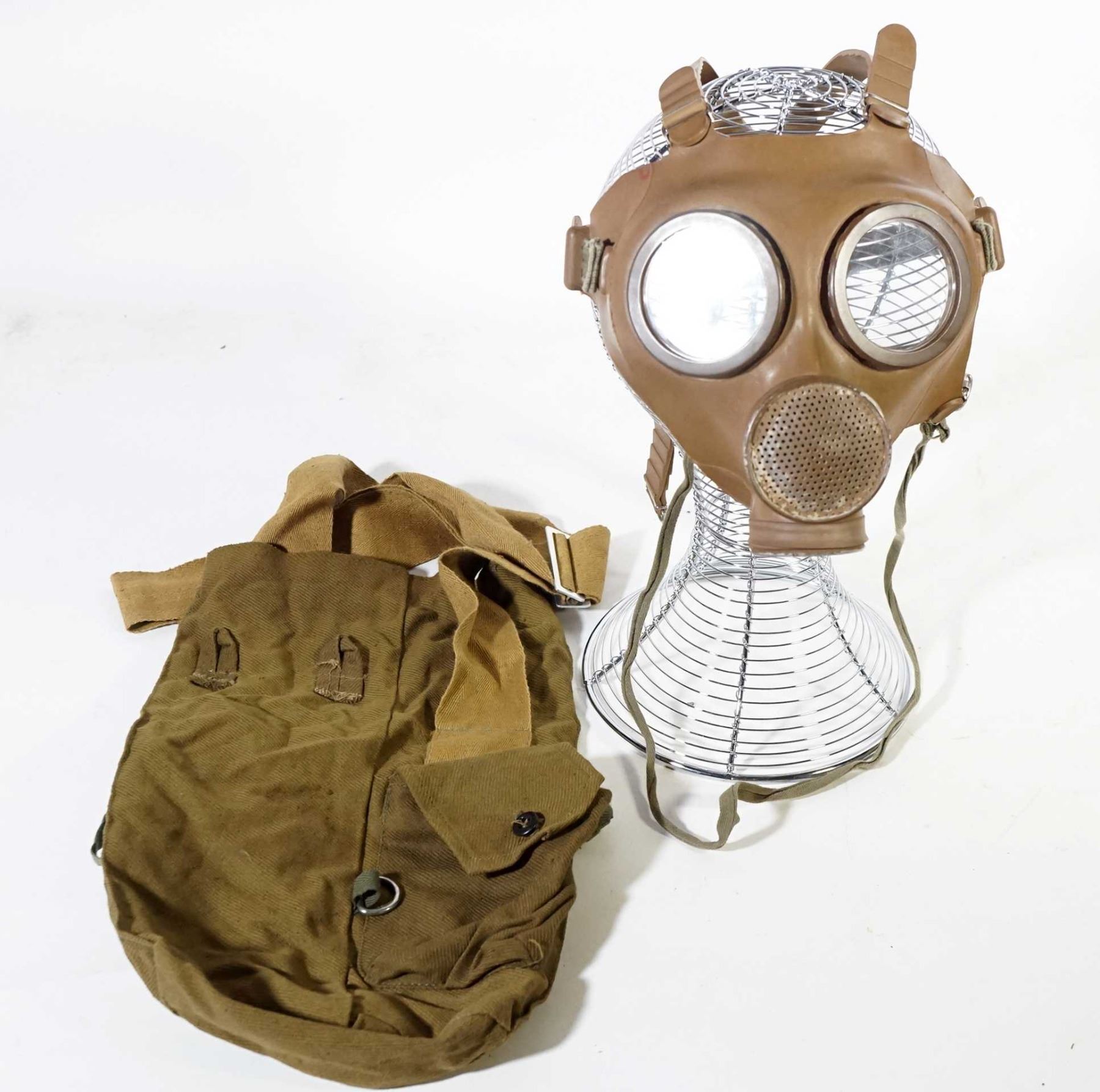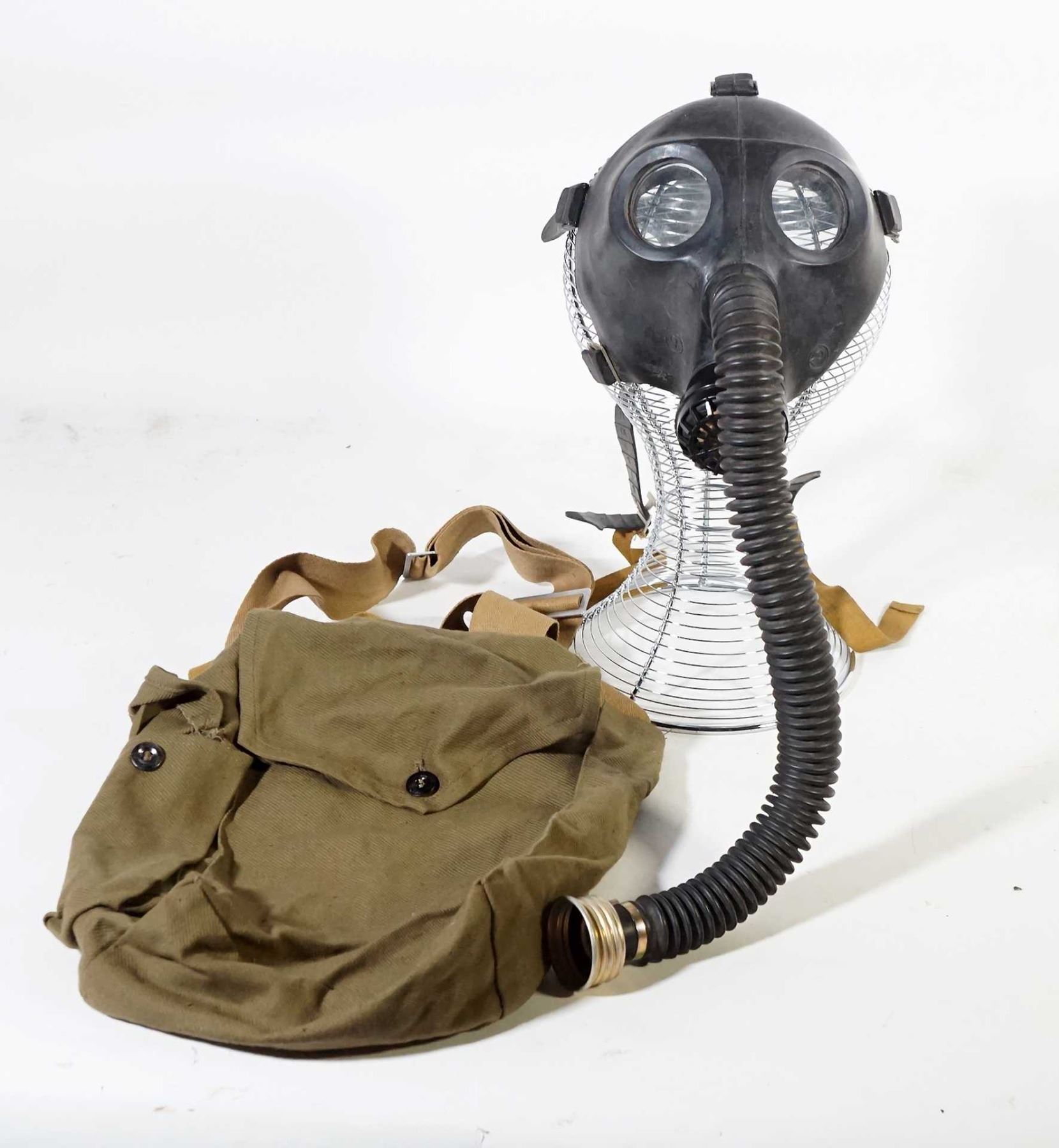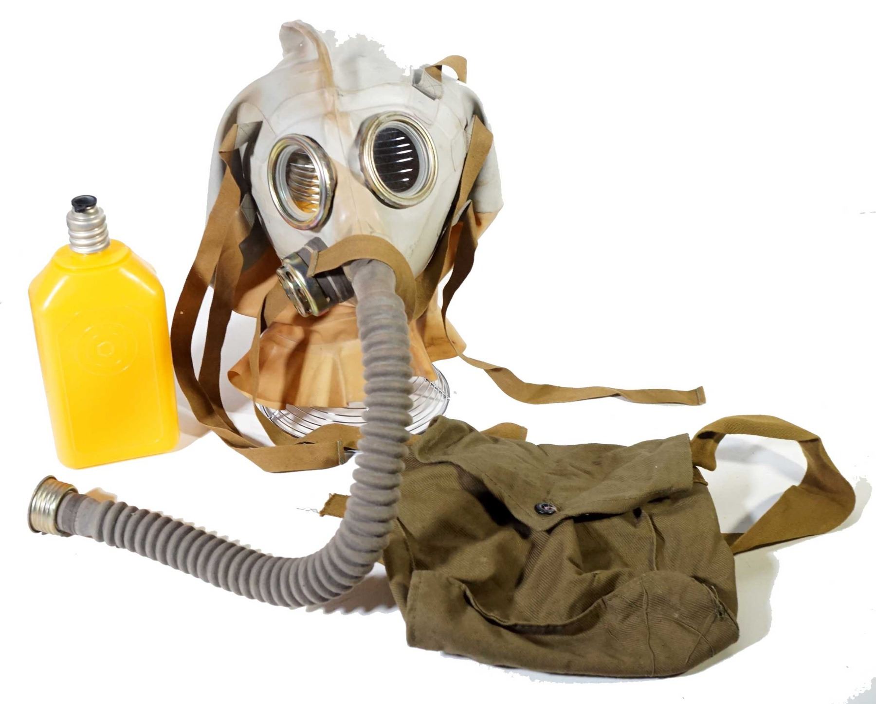 2 Belgium M-51 Masks 1 x black & 1 x brown in canvas bags with 1 Russian M-69 OM 30-IV-69B #11 Head Wound mask in canvas bag marked III-92 R-10-1106-82 and corporate logo.