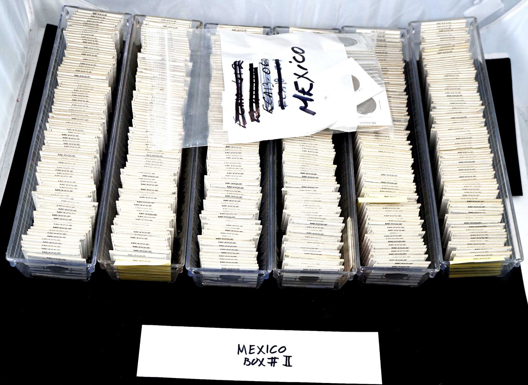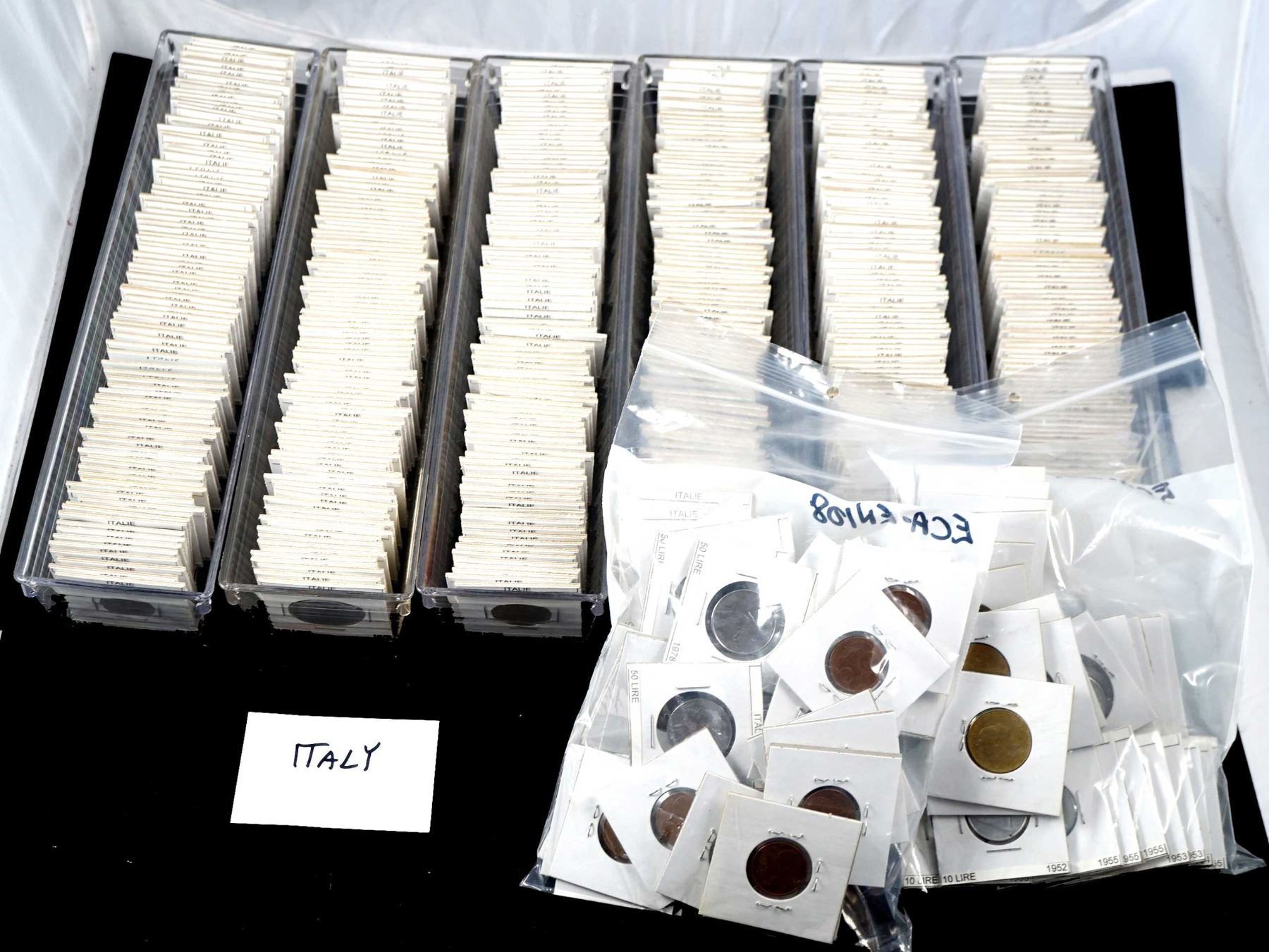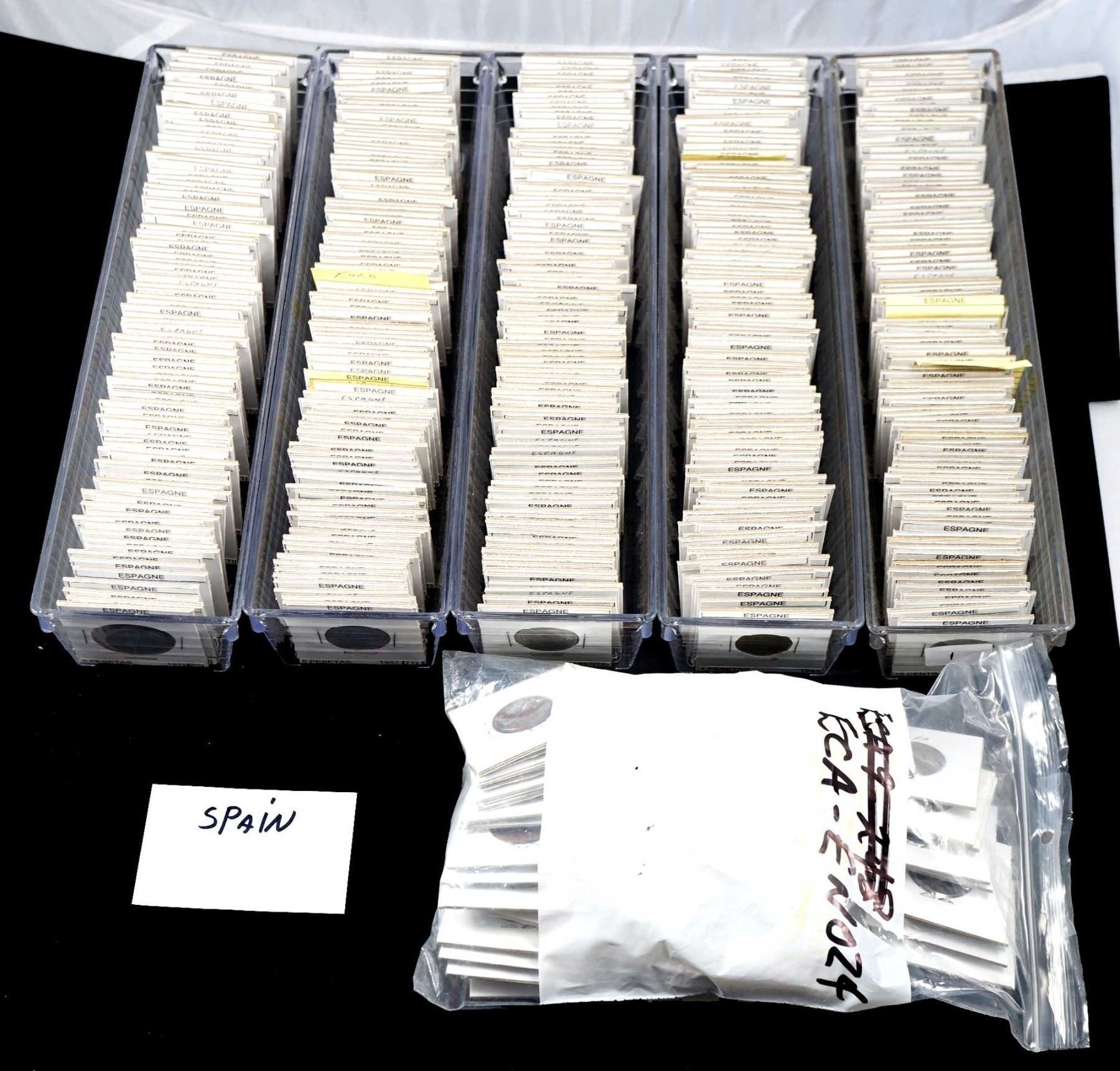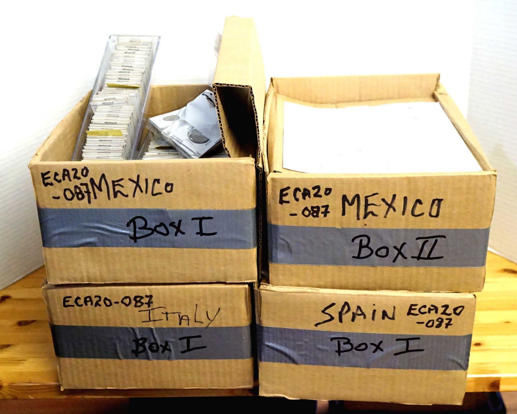 Coins from Spain 10 Centimes to 5 Euro Cents 546 pcs, Italy 10 Centisimi to 5 New Euro Cents 641 pcs.and Mexico 1 Centavo to 1000 Pecos 1415 pcs., all in 2 x 2's with country, denomination and date, many of the dates are multiples, no culls, all saleable.