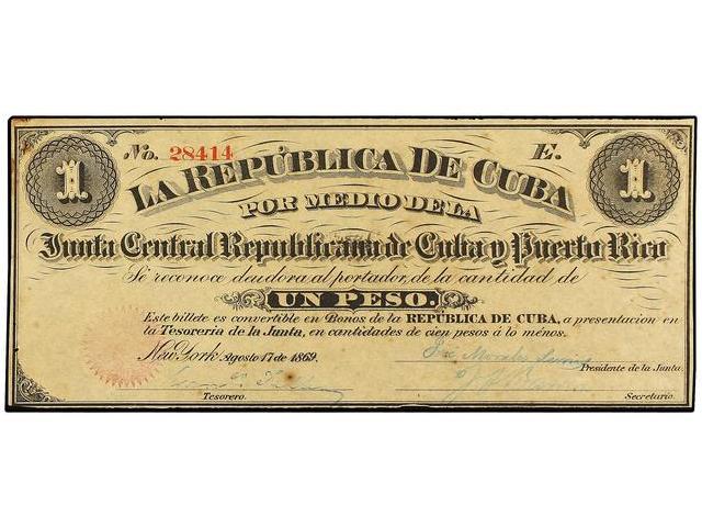 WORLD BANK NOTES - 1 Peso. 17 Agosto 1869. JUNTA CENTRAL REPUBLICANA DE CUBA Y PUERTO RICO. (Pequeñas perforaciones de grapa y pequeña rotura en margen. Leves manchitas). EBC+.