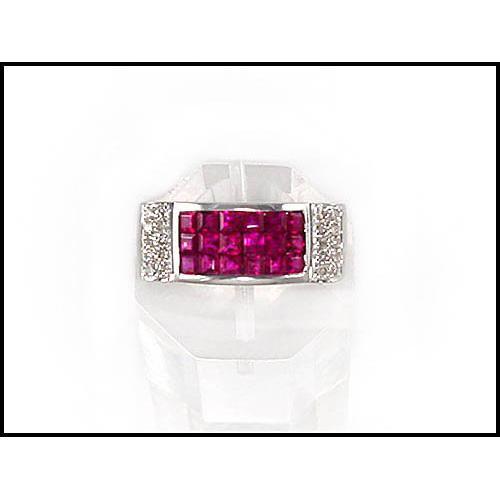 This 18K solid white gold ring, weighing 7.51 grams is the work of a master. 18 collection quality natural rubies (1.75 cts.) are set in the invisible setting style (no prongs). 20 sparkling diamonds create perfect contrast. Size 7 can be changed. Bold in scale (9mm wide), it is still a very feminine piece.