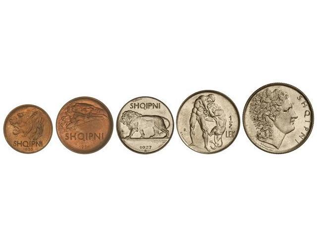 WORLD COINS: ALBANIA - Lote 5 monedas 5, 10 Quind-Leku, 1/4, 1/2 y 1 Leku. 1926-T y 1927. Br, Ni. KM-1/5. SC.