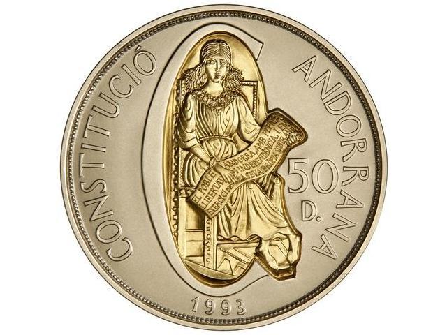 WORLD COINS: ANDORRA - 50 Diners. 1994. AR+AU. I aniversario Constitución Andorrana. Tirada: 5.000 piezas. En estuche original, con certificado. KM-104. SC.