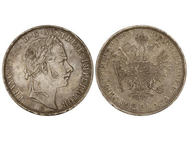 WORLD COINS: AUSTRIA - 2 Florines. 1859-B. FRANCISCO JOSÉ I. AR. Pátina. (Pequeños golpecitos en anverso). KM-2230. MBC+.