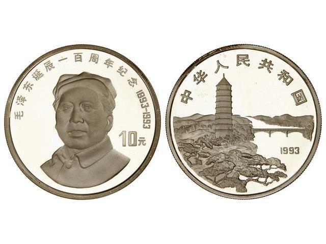 WORLD COINS: CHINA - 10 Yuan. 1993. AR. Centenario Mao Tse Tung. KM-540.1. PROOF.