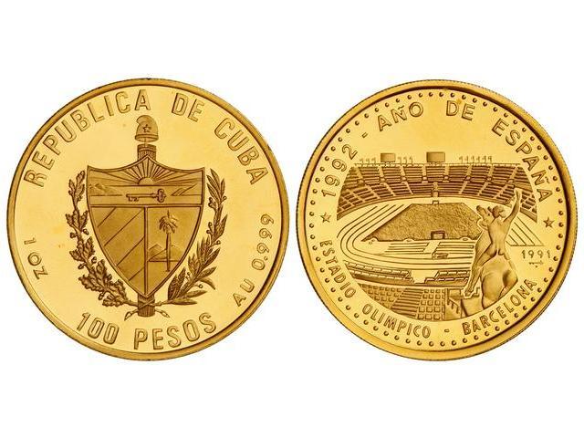 WORLD COINS: CUBA - 100 Pesos. 1991. AU. Estadio Olímpico Barcelona. Tirada: 225 piezas. KM-534. PROOF.