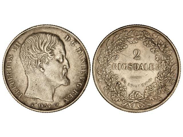 WORLD COINS: DENMARK - 2 Rigsdaler. 1854-FK/FF. FEDERICO VII. AR. (Pequeñas rayitas y pequeños golpecitos). KM-761.1. MBC+.
