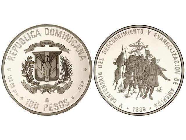 WORLD COINS: DOMINICAN REPUBLIC - 100 Pesos. 1989. AR. V Centenario Descubrimiento y Evangelización de América. Tirada: 1.500 piezas. En estuche original. KM-75. PROOF.