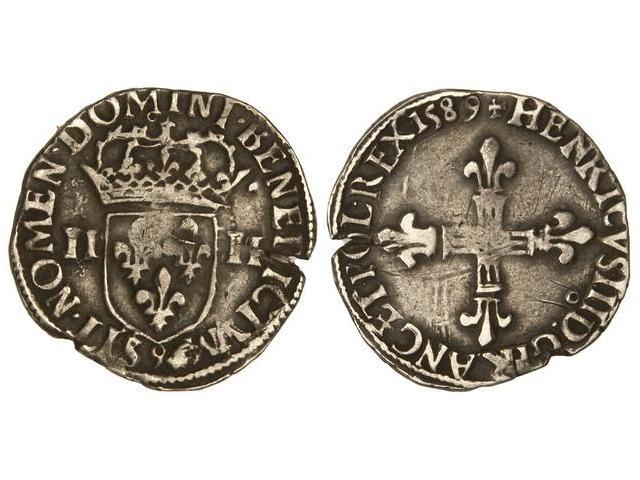 WORLD COINS: FRANCE - 1/4 Escudo. 1589-G. ENRIQUE III. RENNES. AR. MBC-.