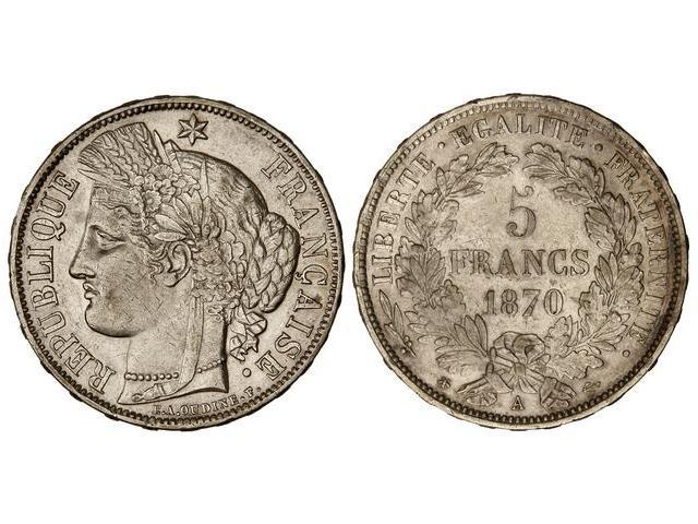 WORLD COINS: FRANCE - 5 Francos. 1870-A. PARÍS. AR. Ceres. (Pequeños golpecitos). KM-819. EBC-.