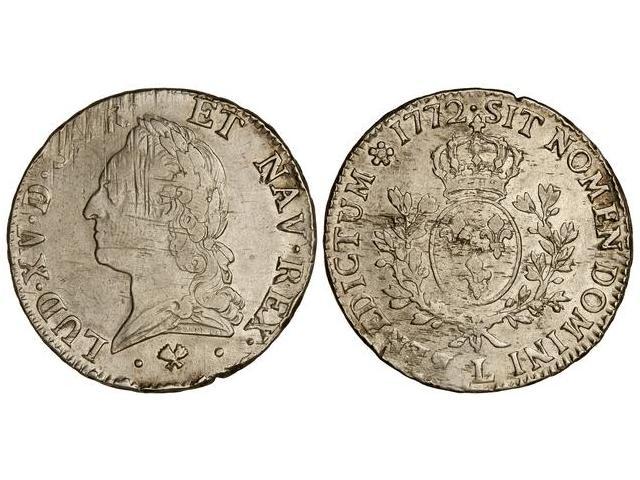 WORLD COINS: FRANCE - Ecu. 1772-L. LUIS XV. BAYONA. (Rayas de ajuste y hojas en reverso). KM-551.9. MBC-.