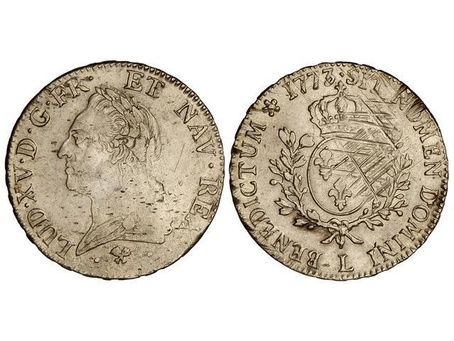 WORLD COINS: FRANCE - Ecu. 1773-L. LUIS XV. BAYONA. AR. (Pequeñas rayitas de ajuste en anverso y hojitas). KM-551.9. MBC-/MBC.