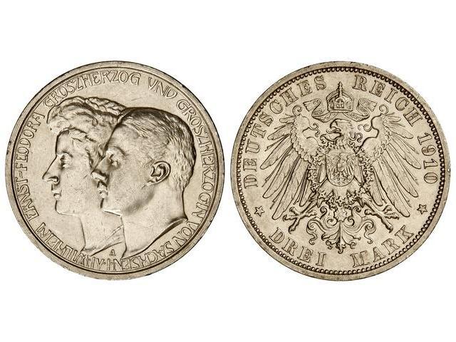 WORLD COINS: GERMAN STATES - 3 Marcos. 1910-A. SAXE-WEIMAR-EISENACH. AR. Segunda boda de Gran Duque y Teodora. Y-176. EBC+.