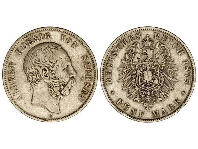 WORLD COINS: GERMAN STATES - 5 Marcos. 1875-E. ALBERTO. SAXONY-ALBERTINE. AR. (Golpecitos). KM-1237. MBC-.