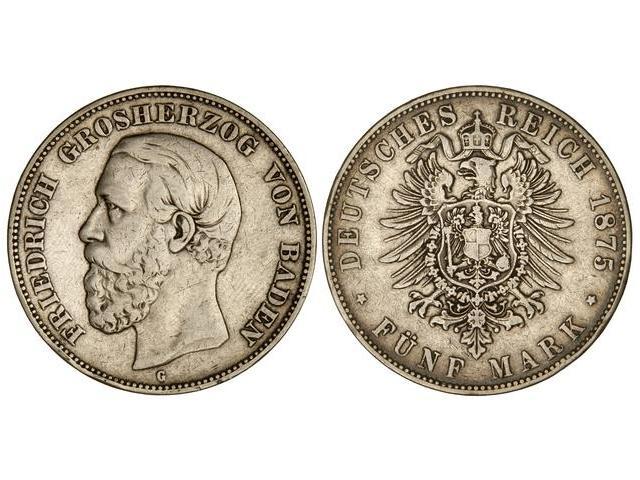 WORLD COINS: GERMAN STATES - 5 Marcos. 1875-G. FEDERICO I. BADEN. AR. La A de BADEN sin travesaño en leyenda anverso. KM-263.2. MBC.