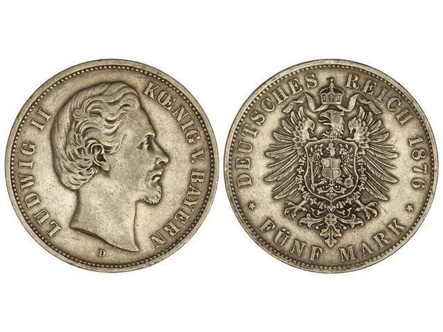 WORLD COINS: GERMAN STATES - 5 Marcos. 1876-D. LUIS II. BAVIERA. AR. KM-896. MBC+.