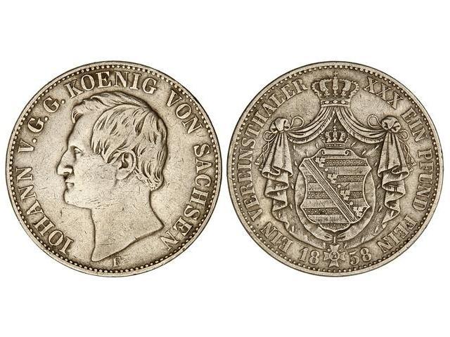 WORLD COINS: GERMAN STATES - Thaler. 1858-F. JUAN. SAXONY-ALBERTINE. AR. (Golpecitos y rayitas). KM-1192. MBC/MBC+.