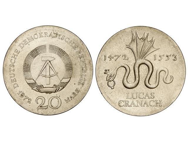 WORLD COINS: GERMANY - DEMOCRATIC REPUBLIC - 20 Marcos. 1972. AR. V Centenario Lucas Cranach. KM-41. SC.