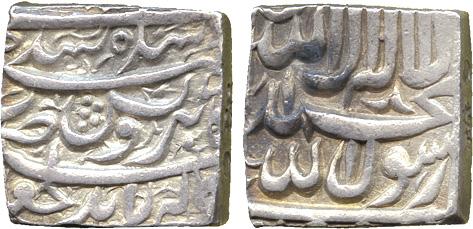 WORLD COINS. INDIA. Mughal. Akbar, Square Rupee, Bangala, no date visible (KM 86.1). Minor staining on reverse, extremely fine and scarce.