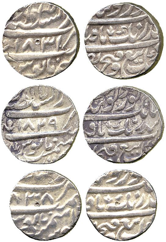 WORLD COINS. INDIA. Sikh Empire. Early Rupees (3), Lahore, VS 1829, 1831, 1838 (Herrli 08.