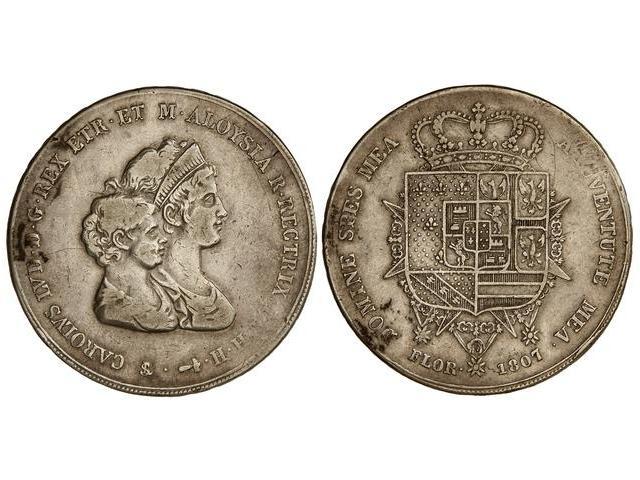 WORLD COINS: ITALIAN STATES - 10 Liras. 1807. CARLOS LUIS y MARÍA LUISA. TOSCANA-FLORENCIA. AR. (Golpecito canto). C-49.2; Vti-20. MBC-.