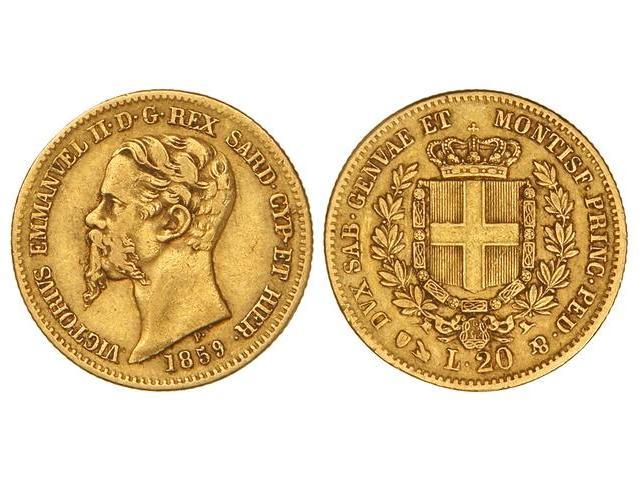 WORLD COINS: ITALIAN STATES - 20 Liras. 1859-P. VÍCTOR MANUEL II. CERDEÑA. AU. C-126.1. MBC-.
