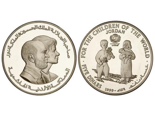 WORLD COINS: JORDAN - 5 Dinars. 1419 d.H.-1999 d.C. AR. UNICEF por los niños del mundo. KM-66. PROOF.