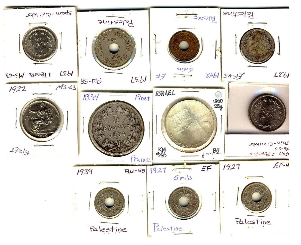 WORLD COINS. Lot of 11 coins. France, Israel, Italy, Spain and Palestine. Should be viewed.