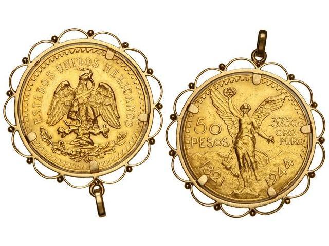 WORLD COINS: MEXICO - 50 Pesos. 1944. AU. Centenario Independencia. Montada en colgante de aro con anilla. KM-481. EBC-.