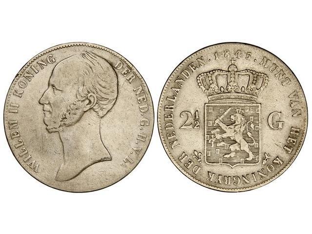 WORLD COINS: NETHERLANDS - 2 1/2 Gulden. 1845. GUILLERMO II. AR. (Golpecitos y rayitas). KM-69. MBC-.