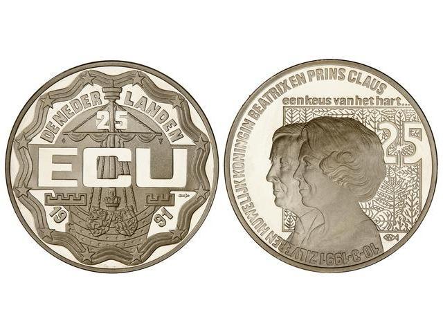 WORLD COINS: NETHERLANDS - 25 Ecu. 1991. BEATRIZ y PRÍNCIPE KLAUS. AR. Bodas de plata. Con certificado original. Schön-X23.1. PROOF.