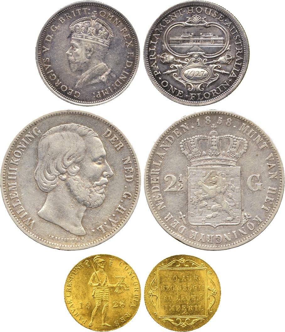 WORLD COINS. NETHERLANDS. Gold Ducat, 1928, 3.49g (F 352), with Crown-sized European coins (4), minor European Silver coins (4), Australia, Parliament Florin, 1927. Fine to extremely fine. (10)