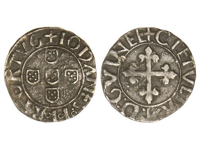 WORLD COINS: PORTUGAL - 1/2 Vintem. JUAN II (1481-1495). Anv.: Cuatro escudos en cruz, alrededor IOhANES II R PORTVG. Rev.: Cruz patada alrededor CI ET VLTRA D GVINEE. AR. (Pequeñas rayitas en reverso). Gomez.06.08. MBC+.