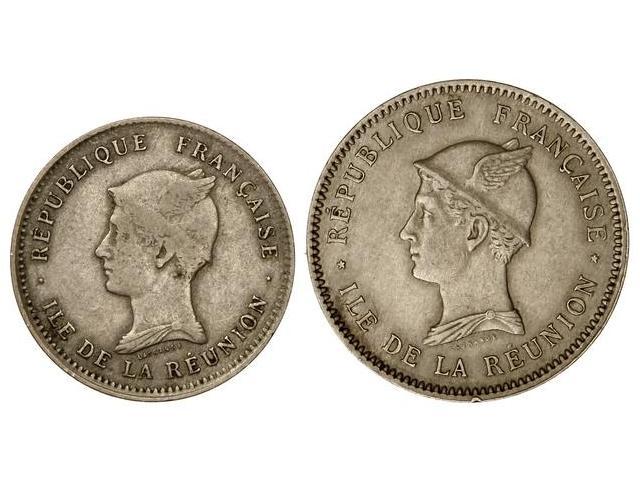 WORLD COINS: REUNION - Lote 2 monedas 50 Céntimos y 1 Franco. 1896. CuNi. KM-4 y 5. MBC y MBC+.