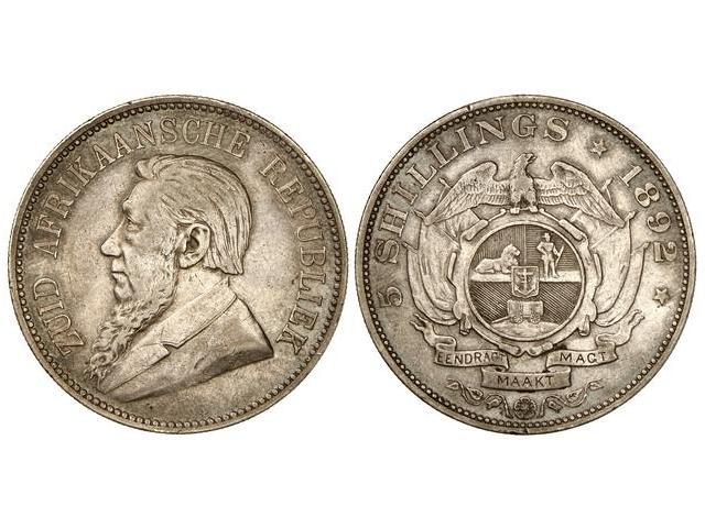 WORLD COINS: SOUTH AFRICA - 5 Schillings. 1892. AR. Carreta con una vara. Pátina. KM-8.1. MBC.
